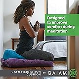 - Embrace a practice steeped in comfort and serenity with the Gaiam Zafu Yoga Meditation Cushion. Skillfully constructed to enhance your meditation, this cushion is an invitation to a more profound and comfortable practice. Each detail is crafted with your wellness in mind, from the adaptive buckwheat hull filling to the soft, yet durable, microfiber cover. This cushion aids in achieving and maintaining the ideal posture for meditation, supporting the spine's natural curvature and alleviating pressure points. The result is a deeper focus and a more effective meditation session, free from the distractions of discomfort. Versatility is at the heart of Gaiam's design. Not just a meditation tool, this cushion serves as a supportive prop for your Pilates exercises, a comfortable floor pillow for your home, and a portable seat for those moments of reflection wherever you find yourself. Incorporate this essential piece of meditation equipment into your daily routine and notice the transformative effects it has on your practice and day-to-day life. Trust in the Gaiam Zafu Meditation Cushion to be the foundation of your practice, supporting your journey towards inner peace and physical harmony.