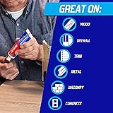 Professional and DIY: All purpose, instant grab adhesive dries white and is paintable for a professional finish Versatile For Interior Projects: Bonds to a variety of construction materials including wood, drywall, plaster, ceramic, concrete, masonry, brick, foamboard, cork and vinyl cove base Quick and Easy: Simply apply with caulking gun; repositionable for up to 15 minutes and fully cures in 12 hours Instant Grab: Zero-second instant grab and high initial tack reduces need for nails, screws, and bracing Easy Clean Up: Uncured adhesive cleans up easily with just soap and water