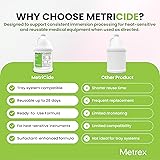- MetriCide 28 Sterilizing and Disinfecting Solution is a high-level disinfectant and sterilant formulated for the reprocessing of immersible and heat-sensitive medical equipment and instruments. Containing 2.5% buffered glutaraldehyde, it provides reliable, broad-spectrum antimicrobial activity for facilities requiring effective disinfection where alternative sterilization methods are not suitable. This ready-to-use cleaning liquid is intended for use in a tray system and may be reused for up to 28 days, provided the solution remains above the minimum effective concentration (MEC). To ensure ongoing effectiveness, the solution must be tested prior to each use with MetriTest 1.8% Test Strips, which are designed to monitor solutions with an MEC of 1.8% glutaraldehyde. MetriCide 28 is recommended for non-critical, semi-critical, and critical medical tools that are fully immersible and sensitive to heat. Common applications include anesthesia equipment, respiratory therapy equipment, rubber and plastic medical objects, and compatible stainless steel instruments. The formulation includes surfactants to enhance surface contact and cleaning performance while remaining non-corrosive when used according to instructions. The solution requires no dilution and is ready to use directly from the container, simplifying workflow and minimizing preparation errors. Lab instruments & equipment should be fully immersed for the recommended contact time, rinsed appropriately prior to patient use, and the solution replaced after 28 days or sooner if MEC requirements are not met. MetriCide 28 disinfecting cleaner offers a dependable, long-lasting solution for hospital, healthcare and clinical environments seeking effective high-level disinfection and sterilization of heat-sensitive medical equipment while supporting consistent reprocessing standards.