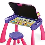 - The Touch and Learn Activity Desk Deluxe by VTech is a three-in-one desk with interactive activity cards that’s expandable for more fun and discovery! The desk features an interactive desktop and five pages to explore that are filled with engaging content including letters, numbers, music, colors and more. Choose from eight expansion packs (each sold separately) that each focus on a specific curriculum like nursery rhymes, reading skills, animals and numbers. It also transforms from a desk into an easel and chalkboard with plenty of storage space for art supplies to encourage play and discovery. The LED display illustrates letter and number stroke order and how to draw basic shapes. For even more fun, your toddler can play with the toy telephone or listen to fun tunes on the music player. Enjoy hours of fun as you create, discover and learn! Stool included. Requires 4 AA batteries (not included). Intended for ages 2 years and up.