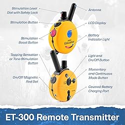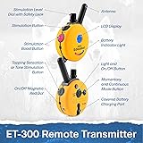 COMFORTABLE FIT FOR ALL BREEDS: Designed for dogs 15+ lbs with adjustable neck sizes from 10–26 inches, this lightweight professional remote training collar provides a secure, comfortable fit for long wear, ensuring effective and stress-free training sessions. SAFE TRAINING SYSTEM: Features 100 stimulation levels with patented blunt stimulation for a gentle yet effective response. Expandable to train up to 2 dogs, this e-collar ensures precise control and consistent, safe training for obedience, recall, and behavior correction. WATERPROOF & DURABLE BUILD: Both the collar and remote are waterproof up to 500 ft, engineered to endure rain, snow, mud, and rough use. Built for active dogs, this rugged training system delivers reliable performance in any weather or environment. QUICK-RECHARGE BATTERY: The ET-300 fully charges in about 2 hours and provides extended battery life for long training sessions. Built for daily reliability, it delivers consistent performance so you can train without pauses or power interruptions. ENHANCED LOW-LIGHT SAFETY: Built-in LED light keeps your dog visible during evening walks, early-morning outings, and off-leash training. Reliable in any condition, it enhances visibility and ensures safer, more confident sessions day or night.