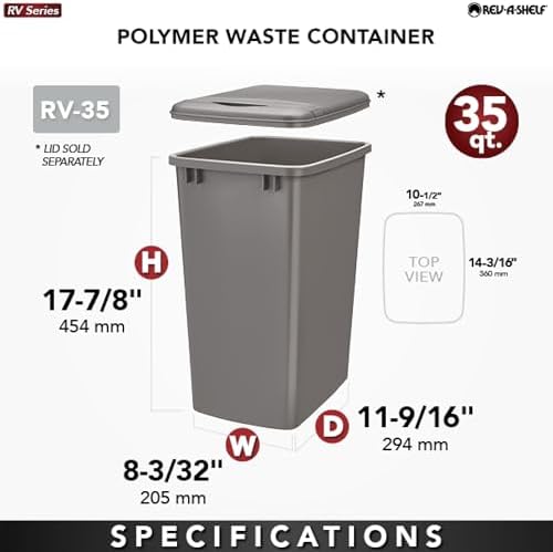 - INCLUYE: (1) Solo contenedor de basura plateado de 35 cuartos de galón; los marcos y tapas de los contenedores de basura Rev-A-Shelf opcionales están disponibles, se venden por separado
