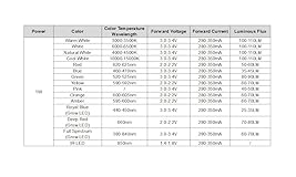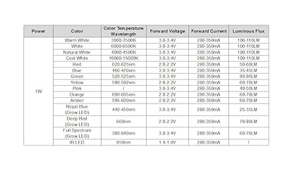 - Specification: Quantity: 10 pieces / Pack Brand: Chanzon Power: 1 Watt (Max) Emitting Color: White (6000K-6500K) Recommended Current: 300mA Forward Voltage: 3.0-3.4V Luminous Flux: 100-110LM Emitting Angle: 120-140 degree With Double Golden Wire (99.99%) and Copper Frame Kindly Reminder: Constant current LED drivers are recommended for high power COB LEDs. Working temperature should be less than 60 Degrees Celsius / (140 Fahrenheit) with a Heat Sink System. Please refer to the positive (anode +) and negative (cathode -) sign on Leds. Related Accessories: Constant current LED drivers (300mA Aluminum Case Waterproof): ? Search B01MYBFR7U on Amazon Constant current LED drivers (300mA Plastic Case): ? Search B01N25KD0R on Amazon Constant current LED drivers (300mA No Case only PCB Board): ? Search B01MUDW3VF on Amazon LED Heat Sink Star Aluminum Base Plate: ? Search B06XKTRSP7 on Amazon