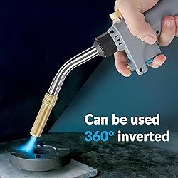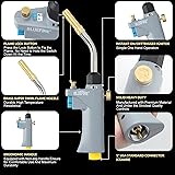 Taiwan-Made Quality:This propane torch head with igniter is made in Taiwan with the highest quality control, ensuring top-notch performance and durability in every propane torch and turbo torch kit produced.Kit sell with BLUEFIRE's 14.1 oz pre-filled Modern MAPP Gas Cylinder, Complete ready-to-work kit; One-Click Ignition with Safety Lock:The auto trigger-start ignition of this propane torch head with igniter makes it super easy to ignite and extinguish the flame with just one click. The instant ON/OFF design ensures you don't need to turn the adjustment knob every time. Additionally, a safety lock is designed to prevent accidental ignition, making this map gas torch kit user-friendly and safe. Continuous Flame and Adjustable Control:The built-in flame lock button on this blow torch adds the function for continuous use, so you don't have to hold the trigger all the time. The adjustable flame control knob allows you to freely size the flame, enabling you to easily switch between different tasks with this versatile propane torch. Ergonomic Cast Aluminum Handle:The ergonomically designed handle of this propane torch head is constructed from cast aluminum to ensure durability and reliability. It provides the user with maximum comfort for long-term use, making it an ideal choice for extended tasks using this turbo torch kit. Ultra-Turbo Swirl Flame:The ultra-turbo swirl flame of this torch head delivers maximum heat output and resists flame blowout, reducing brazing time by 30%. The threading and regulator ensure a secure seal and regulated pressure, delivering consistent performance even when tilted or momentarily inverted, making this an efficient and reliable map gas torch kit.