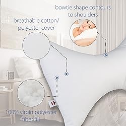 - The Bowtie Pillow gently cradles the neck to help reduce tension, headaches, and neck pain. With its unique shape and soft fiber fill, the bowtie pillow provides even support across the shoulder line for tension-free neck support and comfort for a restful night's sleep. Helps prevent twisting and turning of the neck while sleeping or resting on your side or back. Side bows provide comfortable neck support when sleeping on your side. Either way, the bowtie pillow helps you rest comfortably with its simple and unique design. Made in USA and contains no latex.
