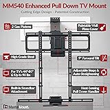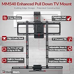 - The MM540 Enhanced Pull Down TV Mount gives you full range motion, the incomparable MantelMount engineering and craftsmanship, ALL of our exclusive features, and complete safety...all in one Pull Down TV Mount! MantelMount's patented construction combines the highest-quality automotive gas pistons with lightweight alloys and state-of-the-art counterbalanced technology, allowing virtually anyone to easily pull a large flat screen TV off-the-wall up to 16 inches, down another 29 inches to an optimal and comfortable eye-level, and then swivel it left or right another 35° in each direction or 60° in one direction. Now EVERY part of the room is the best seat in the house. No more TV glare, neck stain, eye-strain or headaches. Now you have true comfort and the perfect TV view every single sit down. INCLUDES: Built-in sound bar attachmentHeat sensing handles that turn red at 110°Automatic straightening to prevent your TV from hitting the mantelPaintable wall covers to hide the hardware and match your room colorAdjustable horizontal and vertical stops to prevent the TV from hitting your mounting environment8° adjustable tiltCable management tabs to keep your wires organizedAuto-stabilization of the gas pistons to keep your TV level over time29" of up/down vertical travel35° horizontal swivel each way or 60°one way No other mount covers the many requirements of a successful high-on-the-wall mounting like we do. This is NOT just "another TV mount". It's a fully transformed room. True TV viewing satisfaction. An entirely re-imagined, perfected home entertainment experience. It's MantelMount!