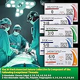 Sutures Thread with Needle (30PK Mix Absorbable: Chromic; Non-Absorbable: Silk, Nylon, Polyester, Polypropylene: 0,2-0,3-0,4-0,5-0,6-0) - Surgical Stitch Kit; Medical, Vet, RN's Hospital Training