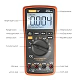 Continuity Test and Voltage Alert: Use the PTC ceramics protection circuit for Resistance and frequency measurement and Shielding Interference and Diode and Continuity Test can be 20000 µF Non Contact Voltage Alert: When the detection of voltage is greater than 700V(RMS), keep close to the conductor, the instrument sensor will light and buzz. With 10 Auto-Ranging: Accurately measures AC/DC voltage and current, frequency, resistance, diode and continuity NCV test, It's a good 10 Function Digital Multimeter Easy Use and Clear Read: Support Data Hold, Auto Shutoff and Continuity Buzzer.With large Overview Backlit LCD display which is visible in low light,3 times readings per second,3 5/6 Digital LCD Backlight Display for visibility in dimly lit areas Package Content: Multimeter, Digital Multi Meter 9V Battery, English User's Manual, 2 x Test Leads, 2 Alligator Clips---The multimeter warranty period is 1 year, if you have any questions during this period, you can contact us as soon as possible.