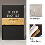 BIGGER, BY POPULAR DEMAND - The Pitch Black Notebook is a reinvention of our beloved memo book. At 4.75" x 7.5," this 2 pack of journals is slightly larger than the typical tactical pocket notebook. Perfectly sized to allow more room for textual flim-flam, so it features some possibly-useful information regarding light and darkness to the inside covers of the notebooks, along with our usual Specifications and Practical Applications. DOT GRAPH OR RULED JOURNAL - This 64-page journal notebook is designed with best-in-class versatility. Choose between dot-graph or ruled paper, printed using soy-based ink, for daily bullet journaling, tracking midnight ramblings, or scribbling down poems when inspiration strikes. ACID-FREE, BRIGHT WHITE - Each field journal features responsibly manufactured 60 lb (90 GSM) Finch Opaque body paper, which is a pleasure to write on, as it's smoother and more substantial than the typical notepad or composition notebooks. The acid-free pages maintain a bright white color to preserve sketches, observation logs, or to-do lists. RUGGED & DURABLE COVERS - Stash your Field Notes notebook in your pocket, car, or backpack for everyday carry. The duplex printed cover, made from 118 lb (320 GSM) kraft cardstock from French Paper Co. in Michigan, handles rough treatment without tearing or curling. It’s bound together by saddle stitch and three glossy black staples that support a flat lay to make quick entries easy and efficient. PROUDLY PRINTED & MANUFACTURED IN THE USA - We take great pride in our complete and transparent origin stories. Each of our thin notebooks and journals is bestowed with evidence of our artisan-first processes, like locally printed pages from suppliers in the midwest and precisely rounded corners stamped by a machine noted inside the back cover.