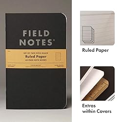 - The Field Notes Pitch Black Note Book 2-Pack with Ruled / Lined body paper inside. Each book is 64 pages bound with glossy black staples and a sturdy 118# cover featuring our exclusive black/kraft duplex paper. This is our larger size and the books measure 4.75" x 7.5".