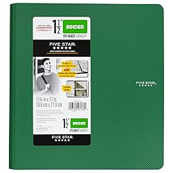- LASTS ALL YEAR. Five Star 1-1/2" Plastic Binder features one-piece construction to withstand frequent use and protect your contents from damage . Holds up to 375 sheets, perfect for keeping handouts, notes and loose-leaf paper all organized in one place. Three D-rings allow for increased paper storage and keep 3-hole punched papers securely in place. Flexible spine structure lays flat for easy desktop use. Includes a 3-pocket divider to keep loose papers neatly organized inside the binder cover. Binder measures 11-3/4" x 11" overall. Available in assorted colors: Black, Red, Blue, Green, White, Purple. Note: Color choice is not available for this item. Color shipped to you is selected at random, and will vary. ACCO Brands will replace any Five Star binder that is returned within one year from the date of purchase. Contact ACCO Brands Consumer Affairs for instructions.