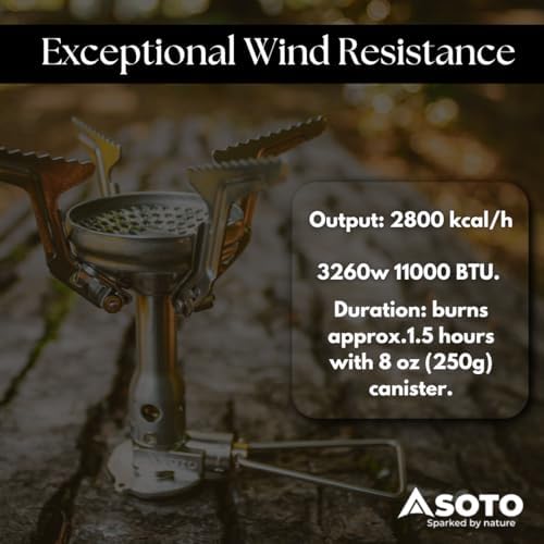 - Exceptional Wind Resistance: Designed for superior portable outdoor cooking or camping stove performance under windy conditions. The SOTO backpacking camp stove maintains a steady flame, ensuring your cooking experience is uninterrupted even in challenging weather. It comes with a Triple O-ring Seal and Metal Seal. Output: 2800 kcal/h 3260w 11000 BTU. Duration: burns approx.1.5 hours with 8 oz (250g) canister.