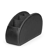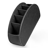 Leather HIGH QUALITY: The Londo Remote Control Organizer is crafted with high-quality PU leather attached with fine and durable stitching, giving it a sleek look and a durable body, combining the pleasant feel and the handsome look of leather without sacrificing versatility and convenience. PRACTICAL: This remote control holder saves space with 5 separate compartments and makes your home, living room, desktop, dresser, or bathroom more organized. It has a large capacity where you can store remote controls of any size. It is also suitable for other items such as cell phones, scissors, pens, glasses, or any other office supplies you need. ATTRACTIVE DESK ORGANIZER: It can be a decorative item on your desk, dresser, shelf & workspace. This remote control organizer is covered in elegant and durable PU leather with delicate stitching to keep your home decor looking stylish and chic while also functioning as a home organizer. Use in your vanity or bathroom to organize make up and other beauty or health and personal care products too MULTIFUNCTIONAL: The Londo Remote Control Organizer also serves as a multifunctional storage caddy, holding various tv remotes including Apple or Roku remotes. The long pocket can hold other electronic devices such as iPads, Kindles, and other tablets, and can be used to store portable electronic devices such as mp3 players, iPods, and various other tools that you keep close to your home entertainment system. PROTECTIVE: The Londo Remote Control Organizer has a soft suede internal lining to protect your devices from scratches and dents. Great gift for your home, RV, camper, college dorm room, small apartment and more, keeping all your remote controls close at hand and easily identifiable, which is not only useful but also stylish. Save more time and space.
