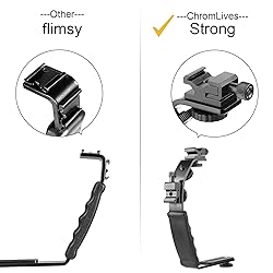 - ChromLives Camera Camcorder L Bracket Video Grip w/ Dual Cold Shoe Mounts Camera flash brackets are designed to increase the distance between the camera lens and the light source in order to reduce the red eye or flash shadows. This L shape bracket works to extend the distance and off-center the flash. Works especial great for portrait photography by adding little more dimension to human face. Features: - Two removable flash shoe bracket to mount your flash light without sliding off. -1/4” threaded hole between two flash shoe bracket for more setup option. -1/4” thread hole on the base plate to mount on a tripod. -1/4” thumb screw at the bottom for any standard camera camcorder. -Camera mount can be adjusted from side to side. -Padded hand grip. Package includes 1 pack of camera L bracket