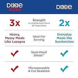 Durable and versatile—Dixie disposable 10 in. paper plates* are perfect for serving everyday meals at home, parties, picnics, and barbecues to make mealtime hassle-free 2x stronger—Two times stronger than the leading comparable store brand 10” paper plate, so you can dish up your heaviest, messiest meals with confidence Strength and Performance—Microwaveable, cut-resistant, and a Soak–Proof Shield to hold up against dressings, sauces, and grease Responsibly made—Dixie 10” paper plates deliver the same strength and performance, but with the added benefit of being compostable except in CA. Convenient pack size— Includes 150, 10” large paper plates to meet your mealtime needs. All Dixie products (paper bowls and paper plates) manufactured in Georgia- Pacific facilities are kosher certified by the Orthodox Union.