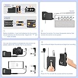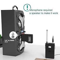 UHF Frequencies--The wireless lapel microphone system has 20 frequencies selection for seamless, interference prevention operation.An easy-to-read LCD information display provides constant monitoring of system operation, Receiver battery condition indicators with low-battery warnings. Convenient and easy to use-- No static,no drop out with use at a distance of 40-65 feet.With unique paired ID synchronization for each wireless transmitter and receiver make setup easy.Setting up a wireless mic is as simple as plugging in a wired microphone. Wireless Headset & Lavalier--Headset microphone fits securely for active speakers and vocal performers.Lavalier microphone with included tie clip offers low visibility and convenient use.optimized for Houses of Worship in a church preaching,YouTube videos,and classroom and presentation applications. Versatile and Compatible Microphone-Work with mixers, pa speakers, electric guitar amplifiers and sound boards with 1/4'' interface to output the sound, ideal for teaching lectures,conference speech, visiting guide.With included 1/4" to 1/8" adapter-cable, suit for camera equipped 3.5mm mic jack recording. What You Get--Wireless microphone set included headset microphone and Clip-on Lavalier Microphone Body pack Transmitter, Receiver with 1/4'' Plug,Solid metal collar clip and windscreen reduces plosives, wind, and breath sounds.Female 1/4" to 1/8" TRS adapter converter cord (for camera). 1/4" to 1/8" TRRS adapter cable (for smartphone).