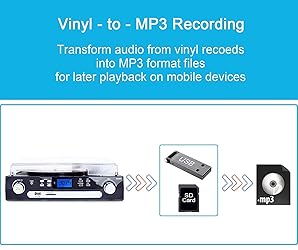 Wireless Bluetooth Connection - Turntable with Bluetooth function. Playing music from external device wireless, such as moblie phone, laptop and other bluetooth device USB/SD Encoding - Converts vinyl to USB flash drive/SD card directly in MP3 format. No PC or laptop required. Traditional Music Playing - Cassette Player with eject and fast forward function. Aux in for connecting of other devices(CD,Ipod,Iphone etc) 3-Speed Record Player - Belt-driven turntable fits for vinyl records at different speeds. 33 , 45, 78 RPM selectable. (Please note:Long press around 5 seconds to power on) More Fuction - Built-in stereo speakers. Analog AM/FM stereo radio, LCD Screen with backlight, Earphone jack. With Dust Cover and 45RPM Adaptor.PICHUAPUDARL PTKIHOCOETL GOUGIND