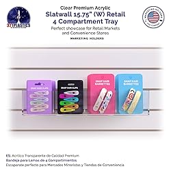 - 4 Pack Slatwall 15.75"W Acrylic 4 Compartment Retail Product Storage Bin Product Features: Four Compartment Clear Acrylic Retail Slatwall Tray These slatwall caddys are designed for standard slatwalls. Will not fit on custom or metal slatwalls. Overall Dimensions: 15.75"W x 4.75"D x 3.75"H. Compartment Dimensions: 3.75"W x 4"D. Thickness: 0.118", 3MM or 1/8". Slatwall merchandise boxes can be used for a variety of products and showcase small items and parts. Proudly made with premium high quality acrylic. Marketing Holders clear acrylic storage bins are the perfect way to display and organize retail merchandise. The durable container has four compartments to keep products organized. The clear caddy combines style and functionality for many types of businesses and service stations. These slatwall containers are great for retail locations or convenience stores to present products in an orderly fashion. These dump bins can also be used in candy stores to display bulk candies and other goods. Customers will love the clear view that allows them to see the contents inside and appreciate a neat and clutter free slotwall display. This slatted wall tray adds style to any item without taking the attention away from the product. Place one or multiple trays by your front entrance to entice customers to purchase new, discounted or impulse items. Slatwall boxes are great to help conserve precious table or counter space in retail locations. Another ideal use for these heavy duty bins are in garages and workshops. Use one or more to organize small parts and hardware. These compartment trays are a great way to maximize the storage space in your work area. These slatwall organizers ship preassembled. No assembly required! *All sizes are approximate *Tolerances: Thickness +/- 10% *These slatwall bins are designed for standard slatwalls. Will not fit on custom or metal slatwalls.