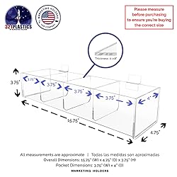 Acrylic Made in USA Four Compartment Clear Acrylic Retail Slatwall Tray. No Assembly Required. Overall Dimensions: 15.75"W x 4.75"D x 3.75"H.Compartment Dimensions: 3.75"W x 4"D. Thickness: 0.118", 3MM or 1/8"*All sizes are approximate Marketing Holders clear acrylic storage bins are the perfect way to display and organize retail merchandise. The durable container has four compartments to keep products organized. The clear caddy combines style and functionality for many types of businesses and service stations. These slatwall containers are great for retail locations or convenience stores to present products in an orderly fashion. These dump bins can also be used in candy stores to display bulk candies and other goods. Customers will love the clear view that allows them to see the contents inside and appreciate a neat and clutter free slotwall display. This slatted wall tray adds style to any item without taking the attention away from the product. Place one or multiple trays by your front entrance to entice customers to purchase new, discounted or impulse items. Slatwall boxes are great to help conserve precious table or counter space in retail locations. Another ideal use for these heavy duty bins are in garages and workshops. Use one or more to organize small parts and hardware. These compartment trays are a great way to maximize the storage space in your work area. These slatwall organizers ship preassembled. No assembly required! *All sizes are approximate *Tolerances: Thickness +/- 10% *These slatwall bins are designed for standard slatwalls. Will not fit on custom or metal slatwalls.