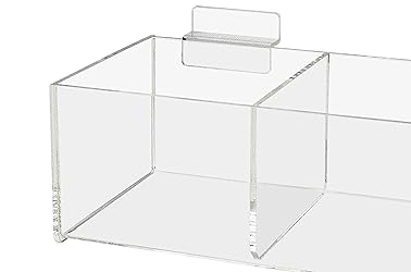 - 10 Pack Slatwall 12"W Acrylic 3 Compartment Retail Product Storage Bin Product Features: Three Compartment Clear Acrylic Retail Slatwall Tray Overall Dimensions: 12.25"W x 5"D x 4"H. Compartment Dimensions: 3.75"W x 4"D. Thickness: 0.118", 3MM or 1/8" These slatwall caddys are designed for standard slatwalls. Will not fit on custom or metal slatwalls. Slatwall merchandise boxes can be used for a variety of products and showcase small items and parts Proudly made with premium high quality acrylic Marketing Holders clear acrylic storage bins are the perfect way to display and organize retail merchandise. The durable container has three compartments to keep products organized. The clear caddy combines style and functionality for many types of businesses and service stations. These slatwall containers are great for retail locations or convenience stores to present products in an orderly fashion. These dump bins can also be used in candy stores to display bulk candies and other dry goods. Customers will love the clear view that allows them to see the contents inside and appreciate a neat and clutter free slotwall display. This slatted wall tray adds style to any item without taking the attention away from the product. Place one or multiple trays by your front entrance to entice customers to purchase new, discounted or impulse items. Slatwall boxes are great to help conserve precious table or counter space in retail locations. Another ideal use for these heavy duty bins are in garages and workshops. Use one or more to organize small parts and hardware. These compartment trays are a great way to maximize the storage space in your work area. These slatwall organizers ship preassembled. No assembly required! *All sizes are approximate *Tolerances: Thickness +/- 10% *These slatwall bins are designed for standard slatwalls. Will not fit on custom or metal slatwalls.