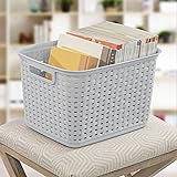 - Bring a touch of style to everyday storage with the Sterilite Weave Baskets, a practical yet decorative solution for organizing clutter throughout your home. These versatile baskets offer the classic appearance of handwoven wicker with the added benefits of durable plastic, making them easy to clean and maintain. Whether you're tidying up living rooms, kitchens, bedrooms, apartments, or home offices, their sleek, woven texture and clean finish allow them to blend effortlessly into any décor, adding a pretty appeal to any setting from rustic to contemporary. Designed for both function and fashion, these sturdy baskets are ideal for storing anything from folded linens and bath essentials to remotes, magazines, dog treat boxes, or school and study table supplies. Use them in a guest bedroom to create a charming welcome basket filled with snacks and small comforts, or in a playroom to contain books, art supplies, and play items. The rectangular shape makes them a great fit for shelving units, countertops, pantries, and entertainment centers, while the open-top design offers quick visibility and easy access to contents. They’re also a handy way to store goods in container jars, bags of chips, extra toiletries, or office materials that need a stylish yet accessible home. The reinforced rims add strength and comfort when lifting and carrying, making them as practical for transport as they are for storage. With three sizes available—Small, Short, and Tall—you can mix and match to create a coordinated storage setup tailored to your space. Whether displayed or tucked away, these baskets combine aesthetic charm with dependable function.