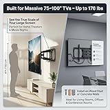 Full motion articulating TV wall mount: Easily tilt up to 15°, swivel 45°, extend up to 24.5 inches, and retract to 2.75 inches to get the ideal viewing angle for your 60–100 inch TV. Fits most TVs: Heavy duty TV mount supports flat and curved 60” to 100” TVs up to 176 pounds compatible with a variety of VESA mounting hole patterns. Supported VESA Patterns include 200x200mm, 300x300mm, 400x200mm, 400x400mm, 600x400mm, 600x600mm, 800x400mm, 800x600mm, and 900x600mm. Install on wood studded or concrete walls: Large TV mount full motion Includes hardware for installation on either a wood studded wall or a solid concrete wall or concrete block wall. Built as a TV wall mount 75+ inch TV, this large TV wall mount offers durability and strength, ensuring your investment is well-supported for years to come. Can be installed by homeowners or professional installers. Cable management system: Heavy duty wall mount TV bracket includes cable clips allow you to route unsightly cables through the mount, perfect for those who like to keep a clean, decluttered and organized TV and entertainment area, as well as those who want flexible viewing angles, maximum safety, and a professional-looking setup. Perfect for movie nights, gaming sessions, or enhancing your home theater experience. It's ideal for homeowners, office spaces, and entertainment enthusiasts looking for a secure and adjustable mount placed in living rooms, offices, or conference rooms,