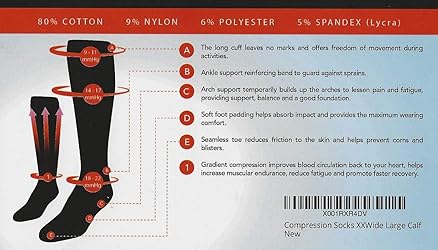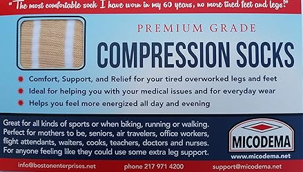 1 pair, Cotton 73% / Spandex 19% / Nylon 8% | 100% Guaranteed | MICODEMA® Imported SIZE CHART in the 2nd PHOTO. Measure carefully, chose X-WIDE, or XX-Wide. Designed and Tested in USA Do you feel the need to continually change positions because you feel discomfort in your legs? Want to get relief from tired achy feet and legs, and the painful stinging, burning, and heavy feeling? SEAMLESS TOE Reduces Friction | REINFORCED ANKLE BAND adds extra Support to your Ankle. NOT your typical thin compression hose. 80% cotton, soft and comfy, non-irritant with padded soles.