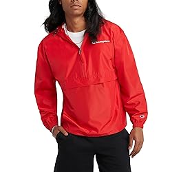 - PACK IT UP & GO. Wind and water-resistant, this ultra-lightweight unisex jacket can be towed along on all your outdoor endeavors. Pack it up into the front pocket and stow it away so you'll always be ready when the weather takes a turn. This jacket for men and women features a half-zip front, scuba-style neckline, and a hood with a bungee cord closure for ultimate protection. Unisex fit is roomy enough for easy layering over sweatshirts and long-sleeve tees. The iconic script logo at the left chest is recognizable on and off the field.