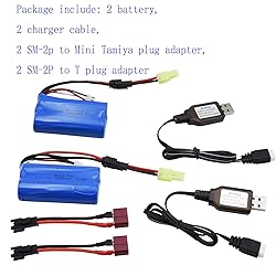 - Attention:Check this battery size and plug fit your RC Device or not before buying. 7.4V 2S 1500mAh Li-ion rechargeable battery replacement for Some kind RC Vehicles Cars,which battery is same connector and battery size, and same voltage as ours.. 7.4V 1500mAh SM-2P battery plug: SM-2P Connector plug,7.4V; Cell: 2S ; Capacity: 1500mAh; discharge rate: 15C ; Charge plug: JST-XH 3 pin Connector. 7.4V 1500mAh Li-ion Battery SM-2P Plug for Old version TKKJ Skytech H101 H105 H103 old version Remote control RC Boat RC Car RC helicopter RC Vehicle Buggy Trucks. 7.4V 1500mAh Li-ion battery suitable for X-TMAGA HS18305 18350 1/18 scales Remote control Trucks. 7.4V 2S 1500mAh Li-ion battery suitable for Compatible with only some Remote Control Trucks,which battery are match. Battery Size: 70*37*19mm /2.77*1.44*0.73 inch(L*W*H) . battery Weight: 95g/3.35oz. Advanced 7.4V 2S 1500mah Li-polymer rechargeable batteries fit for your RC car trucks boat and any devices that the voltage, connector plug, dimensions can fit. 7.4V 1500mAh Lithium battery suitable for Some kind of RC Trucks,which size,voltage, and plug all match. Cables input: DC 5V, output current: 7.4V 1000mA. Green light flashing when charging, green light stop flashing after full charged. Package include: 2 x 7.4V 1500mAh Li-ion Rechargeable Battery with SM-2P plug 2 x cables 2 x Female SM-2P to male mini tamiya converter cables. 2 x SM-2P plug to T plug converter cables.