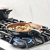 - Cook up family-sized weeknight and weekend meals with the superior ceramic nonstick cookware features of the Farberware(r) Glide(tm) 11-Piece Copper Ceramic Nonstick Cookware Set. This essential collection of saucepans, frypans and a Dutch oven is constructed from fast and even-heating aluminum, and boasts CopperSlide(tm) technology for effortless nonstick food release and easy cleanup of even the stickiest recipes. The copper ceramic nonstick is dishwasher safe for easy cleaning, saucepans include snug-fitting glass lids to seal in heat and moisture, and easy-hold cookware handles provide a comfortable, confident grip to flip, fry, and saute with ease. Oven safe to 350°F for stove to oven versatility, the pots and pans are backed by Farberware's lifetime warrantee. Plus, the set boasts three Prestige kitchen utensils including a slotted turner, slotted spoon and pasta fork so you can start cooking right out of the box. The full nonstick pots and pans cookware set includes: a 1-Quart Saucepan with Lid, 2-Quart Saucepan with Lid, 5-Quart Dutch Oven with Lid, 8.5-Inch Deep Frying Pan 11.25-Inch Deep Frying Pan, Slotted Turner, Slotted Spoon, and a Pasta Fork. For great performance and long-lasting durability, reach for the Farberware Glide 11-Piece Copper Ceramic Nonstick Cookware Set.