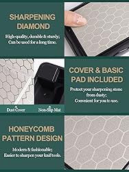 ✤Double-sided Sharpening: You will receive the whetstone in different sides, 400# side for grit coarse sharpening and 1000# side for grit fine sharpening. The unique honeycomb design ensures that the dust generated during the grinding process will not affect the sharpening. ✤Efficient Material: This knife sharpening stone uses diamond as abrasive material which is more efficient than normal whetstone and less risk of damaging the edges. Due to the high hardness of the material and the low loss during use, our whetstone plate can be used for a long time. ✤Convenient: This sharpener stone comes with silica gel base, non-slip and safe to use. The whetstone kits are small in size and light in weight, so they are easy to carry and store without taking up too much space. ✤Easy to Use: You just need to place the knife on the sharpening stone and move it back and forth several times while maintaining an angle of about 30°. This Diamond Sharpening Plate can be used by everyone from stay at home moms to various professionals. ✤Various Applications: The sharpener stone set is very suitable for grinding family kitchen and outdoor tools, woodworking chisel, jade, seals, or carving knives. This sharpening stone kit definitely a PERFECT GIFT for your family & friends.