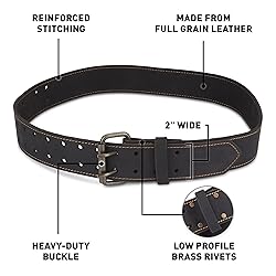 Leather Full-Grain Leather Belt: Made from premium top-grain oil-tanned leather, this tool belt is built tough to withstand heavy use while maintaining durability and style for professional-grade performance Adjustable Fit: This extra large tools belt ensures an adjustable fit, making it one of the best leather tool belts for men seeking secure comfort and professional performance - see sizing guide 2" Wide: The leather tool belt provides excellent stability and comfort, distributing weight evenly to keep you focused and pain-free. 2 inches of width balances a pain-free use and tough performance Heavy Duty Belt: Reinforced Rivets at common stress points to reduce wear and tear. This brown belt can carry contractor tools to keep all construction tools within reach is worn as a toolbelt Stitched Perimeter: This leather belt is stitched around the edge with rivets on stress points, allowing this brown belt to stand up to constant use without fraying