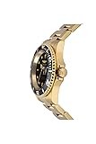 Gold tone stainless steel case 40mm diameter x 12.5mm thick; Black dial; Magnified date window; Luminous hands and hour markers Japanese quartz movement, PC32 Caliber; Assembled in Japan; SR626SW battery included; Watch weight: 140 grams Gold tone stainless steel band, 180mm L x 20mm W; Band is adjustable by adding/removing links; Fold over safety clasp Flame Fusion crystal; Push/pull crown; Uni-directional stainless steel bezel with black top bezel ring; 200 meter water resistant: Suitable for professional marine activity and surface water sports. Suitable for diving.