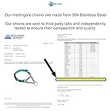 - Our Martingale Chain Dog Collar is a heavy duty, reflective, locking, nylon clasp chain martingale dog collar. It has many features not normally found in martingales. The collar is 2mm thick and very strong and made for the largest of dogs. Its quality nylon webbing contains reflective stitching for improved nighttime visibility. We use a 304 grade welded link stainless steel chain which we verify through independent lab testing. ( Link to lab test) We also feature a lockable nylon clasp which prevents an accidental releasing of the latch when grabbing the collar. Size Nylon Thickness Collar Width Dog's Neck Size X-Small 1.5mm 1/2" 10"-12" Small 2 mm 3/4" 12" - 14.5" Medium 2 mm 1" 14" - 17" Medium-Large 2 mm 1" 16" - 19" Large 2 mm 1" 19" - 24.5" Features: - Comes in 5 sizes (XS, S, M, ML, L) - 5mm thick D-ring - Reflective stitching for improved nighttime visibility - Locking nylon clasp for increased safety - Separate Easy Loop Tag Holder used under license from Cycle Dog Inc. US Pat 9,027,515 (not on XS size) - 304 Stainless Steel Chain Sizing Chart