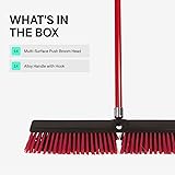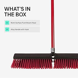 Works great for patios, garages, sidewalks, decks, warehouses, and much more indoor / outdoor surfaces High Quality Broom Head Measures 24'' and Features Sturdy 3'' Long Bristles That Sweep Up Fine Dirt Particles and Sweep Away Large Debris. Also a good sweeper to use on cement, concrete, and asphalt. The broom features thick sturdy bristles inside and flagged fine bristles on the outside. Features an Alloy Handle with a Hook to Conveniently Store When Not Used.