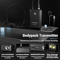 ENHANCED SIGNAL RELIABILITY: Harnessing the power of Auto Scan, the wireless headsert lapel microphone system rapidly identifies the least-interference frequency to sync. This advanced feature of the microfonos inalambrico increases anti-interference ability and decreases interference between each channel. The wireless DJ microphone system also has lock function to lock selected frequency. 2x100 Selectable UHF frequencies allows multiset operation of up to 16 transmitters simultaneously PREMIUM WIRELESS PERFORMANCE: Dual UHF cordless mic set with selectable frequency. Channel 1: 536.57 - 561.32 Mhz (100 frequencies). Channel 2: 562.37 - 587.12 MHz (100 frequencies). The microphone wireless system employs PLL frequency synthesized technology to provide hassle-free sound transmission, minimum dropouts, and maximum feedback rejection. Smooth and quick IR synchronization. Long range operation for this microfono inalambrico set of 290 ft – 328 ft line of sight REFINED SOUND CLARITY: With specially tuned EQ, the dynamic microphone features fuller low frequencies, bright high frequencies, and a balanced midrange. Also, employing a cardioid polar pattern, the handheld mic ensures precise sound pickup and greatly reduce background noise. Moreover, The unidirectional lapel and headset microphones accurately capture sound from the intended direction, effectively rejecting ambient noise that omnidirectional mics might pick up VERSATILE TRANSMITTER OPTIONS: Choose between durable metal built handheld and premium ABS crafted bodypack transmitters for maximum versatility. The bodypack pairs with lapel or headset mics for discreet, hands-free use. Both transmitters feature a mute function for added convenience. With wireless headset, wireless lavalier, and dynamic handheld mics in one set, it satisfies various needs. Suitable cordless microphone for singing, speaking, church, wedding, meeting, DJ gigs, etc BOX CONTENTS: 1 x dual wireless metal receiver for long coverage, 1 x handheld microphone wireless, 1 x UHF bodypack wireless, 1 x lapel lavalier microphone, 1 x headset microphone, 1 x 1/4’’ audio cable, 1 x power adapter, 1 x 6.5 mm to 3.5 mm adapter, 4 x AA battery for 16 hrs long hour use, 2 x antenna, 1 x user manual, 1 x anti-rolling ring, 4 x rubber feet. You can source all necessary components from our store, enabling the quick and efficient setup of your system according to your specific needs PURCHASE WITH CONFIDENCE: Phenyx Pro products are crafted with premium components and precision engineering, ensuring trusted quality and lasting reliability. We stand firmly behind every product we make