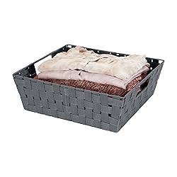 DURABLE: The tote is made of thick woven polypropylene fabric strapping. It is wrapped around a durable steel epoxy coated frame to hold its shape. It is easy to wipe clean and is sure to last. HANDLES: The storage basket has 2 wire integrated open handles. This makes it easy to pull it off the shelf and carry it around. MULTIPUROSE: The small woven basket is great for clothes, accessories, toys, desk supplies, bath and beauty products, and more. The versatile design is perfect to organize any space in your home, bathroom, dorm room, or office. STYLISH: This tote is stylish and functional. It offers a modern way to tidy your messy space and declutter your home. DIMENSIONS: The large shelf tote basket is 15” x 13” x 5”