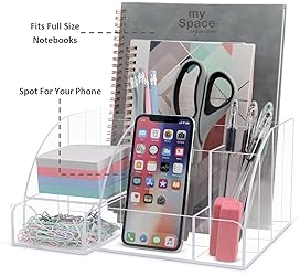 - Clear Acrylic Office Desk Organizer made of high-quality acrylic (Lucite). Organizer features 9 compartments including a drawer, for ultimate office organization and storage. 2 Large compartments that can hold full size file folders, notebooks, planners, papers, bills, or a tablet. 3 compartments for pens, pencils, markers, highlighters, scissors, ruler, and anything else tall and thin. 1 compartment for little stuff like paperclips and safety pins. 1 compartment for your phone, or other office supplies like glue, whiteout, stapler, scotch tape, or just another spot for small stuff. 1 compartment for sticky notes, or other office supplies. And 1 drawer, for anything you have on your desk that you want to hide, or you can use it for sticky notes (fits 4 pads, instead of post it dispenser). No need for another desk organizer tray. Dimensions are 10”x7.3”x5”.