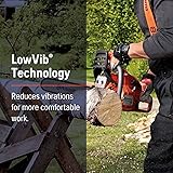 - Ajustes y manejo sencillos: cuenta con un sistema de tensión lateral posicionado para ajustar fácilmente la holgura y tecnología LowVib que utiliza amortiguadores para reducir las vibraciones para facilitar el manejo de las barras de motosierra recomendadas de 14 a 16 pulgadas