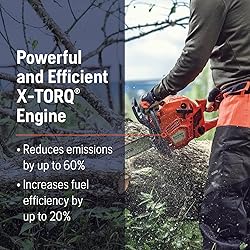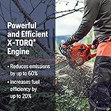 - Potente y eficiente: motosierra a gasolina con un motor X-Torq de 38 cc y 2,1 CV que reduce las emisiones (hasta un 60%) y aumenta la eficiencia del combustible (hasta un 20%), mientras que el control combinado de estrangulamiento y parada ayuda a reducir el riesgo de inundación del motor