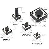 ⭐️【125pcs Tactile Switch】This micro switch kit has 25 types of push button switch, each with 5 buttons, totaling 125 momentary switch. ⭐️【Multiple Sizes】The size types of micro switch are: 2 x4mm、3x4mm、3x4x2mm、3x6x2.5/3.5/4.3/5mm、4x4x0.8/1.5mm、4.5x4.5x1.5/3.8/5mm、6x6x3.1/4.3/5/12mm、12x12x5/7.3mm (The height of the size does not include the height of the pin) ⭐️【High Quality】The push button switch adopts a high-precision mechanism design, which is sturdy and durable, ensuring perfect operation. Excellent quality makes the momentary switch have a longer service life. ⭐️【Easy To Operate】When you apply pressure, the switch will turn on. When the pressure is released, the switch closes. The internal structure of the tactile switches is controlled by metal springs. ⭐️【Wildly Application】This momentary push button is widely used for TV, Audio equipment, Video recorders, Cameras, Computers, Game consoles, Fax machines, Walkie-talkie, baton, Machine tool control unit, Photocopying, Printers and others household appliances.