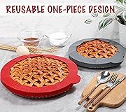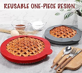 NO MORE BURNING - Silicone pie crust shield protect your pie crust from burning while baking, and you will get a nice golden glow pie without burning edge, perfect for homemade pie, tart and pizza. 100% FOOD GRADE SILICONE – The pie crust shield made of food grade silicone which passes PINCH TEST. Working temperature is -40°F - 446°F. FITS ALL SIZES PIE DISH – Special deign makes the pie shield adjustable that fits from 8.5-Inch to 11.5-Inch including rimmed pie crust molds. EASY TO USE – Just place shield on the top of your pie before baking. Check crust 10 minutes before pie is done. Remove shield if crust needs additional browning. Replace shield if crust is brown enough. Dishwasher safe.