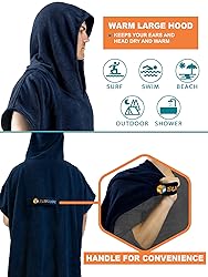 SURF PONCHO CHANGING ROBE SURFING: Made of 100% microfiber polyester, surf poncho towel is made for changing out of wetsuits, swimsuits, and swim wear at the beach or pool. Designed for surfers, watersports, and camping this towel robe wrap is fully absorbent and quick dry. Soft towel poncho robe doubles as a fully absorbent towel hoodie cover up robe for drying off after surfing or swimming, keeping you cozy, warm, and dry. Wearable robe towel features a large hood and front pocket to keep. WEARABLE TOWEL PONCHO: Surf towel robe for men women has a comfortable oversized hood for sun, rain, and wind protection. Microfiber hoodie dryrobe helps secure the poncho while keeping your hands free for changing without risk of dropping clothes. Beach changing robe is also great as a swim hooded towel or cover up robe/shirt/dress/wrap after swimming at the pool. Wearable towel features a large kangaroo pocket for cell phone, wallet, keys, and other essentials. PERSONAL WETSUIT CHANGING ROOM: Ideal for discreet modest changing robe in public while keeping you warm from the wind, cold weather, or dampness. Hooded beach towels for adults feature wide armholes and bottom opening for ease of movement while changing. Adjustable buttons at sleeve openings offer flexibility and full coverage. Change anywhere, portable changing room is best for surfing, beach, swimming. watersports, camping, lake, river, travel, and outdoor outfit changes. SURF TOWEL ROBE WITH HOOD & POCKET: Wearable towel poncho is versatile and can be used as a beach coverup or a warm pullover hoodie. Great for home as a bath towel robe with hood, towel dress for women, outdoors, or camping. Large comfy hood helps to shade from the sun and keep your wetsuit, suits, and clothes sand free and dry. Surf poncho for adults is an essential gift idea for surfers, swimmers, triathletes, gym, and beach lovers. Surf towel robe for beach is a must have surfing accessory. HOODED TOWEL ADULTS MEN WOMEN: Unisex and ONE SIZE fits most men, women, surfers, adults, and teenagers. Length measures 44 Inches from shoulder to bottom. Machine wash, tumble dry low. Absorbent microfiber polyester is quick dry featuring a sewn in handle in the back for easy carrying and hanging to dry. Poncho hooded towel robe is lightweight, foldable, and compact for travel. Navy blue surf towel robe for beach is a must have surfing accessory and a great cover up towel robe for men/women.