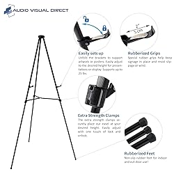 Durable - Made of strong, premium lightweight aluminum, with a satin anodized black finish. Heavy duty claps securely hold your easel in place at your desired height Easy Set Up - The easel easily sets up to 37" to 70" with a quick tug on the legs and one touch lock. Once finished, it easily breaks down and collapses to 37". Easy to store or transport it without taking too much space Poster Supports - The adjustable art holders fold out and can be adjusted up or down on our easel for any odd-sized posters or boards. Special textured rubberized grips on the supports help hold signage in place. Supports up to 25 lbs Sturdy - Non-slip rubber feet for stability indoors and outdoors. Ideal for store, wedding, and event display posters Versatile Applications - Ideal for presentations, artwork, signage, classrooms, trade shows, and events. Works great with foam boards, poster boards, canvases, and more.
