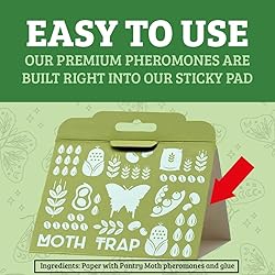 NOT FOR CLOTHING MOTHS, OR GYPSY MOTHS. PROTECT your PANTRY and FOOD WITH CONFIDENCE! Say goodbye to nasty, messy, annoying moths spoiling your food and messing up your pantry and kitchen. SAFE AND NON-TOXIC PROTECTION FOR YOU AND YOUR FAMILY: Feel secure knowing that these non-toxic pantry moth traps are capturing and killing the moths in your pantry while being safe for your family. Protects your flour, cereal, grains, pet food, bird seed and more. LONG LASTING PERFORMANCE: The bottom line is that “these traps work”. Our traps contain a special pheromone attractant mixed with glue that attracts male moths which then stick to the trap so they can’t mate with the females. The result is an end to the hungry larva that eat your food! EASY TO USE: Our premium pheromones are built right into our sticky pad to maximize the attraction – no skinny pheromone strips to bother with! Just fold the trap into a triangle and place in your pantry. BUY WITH CONFIDENCE: We’ve spent years in the labs creating the best non-toxic pantry moth traps in the business and will give you a full refund if you aren’t completely satisfied. Ingredients: Paper with Pantry Moth pheromones and glue
