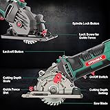 DURABLE AND POWERFUL MOTOR: Featured with a 4 Amps copper motor, the compact circular saw can reach a high cutting speed of 4500RPM to cut wood, plastics, plaster board, PVC with ease. Heavy gauge iron wraparound base and aluminum upper cover adds extra durability and safety PRECISE AND ADJUSTABLE CUTTING DEPTH: With the scale ruler, the mini circular saw keeps the cutting on a straight line. Also the parallel guide attachment allows you to make a precise and quick cut with ease. Easy-set depth gauge lever for adjustable cutting depth from 0-25mm(1’’) ERGNOMIC AND SAFE: The soft rubber handle reduces hand fatigue effectively. Also with a dust port and the saw dust pipe, you can connect it to your vacuum to maintain a clean working environment. The double protection switch enhances safety in use 3 BLADES AND COMPACT: Comes with 3pcs blades for wood, PVC and plastic cuts, small size and weight also make it a good addition to your toolkit. Even DIY beginners can easily start cutting work around the house and in the workshop PACKAGE CONTENTS: 1 * Compact Circular Saw; 3pcs Saw Blades; 1 * Hex Wrench; 1 * Scale Ruler; 1* Dust Exhaust Pipe; 1 * User Manual. If you are not satisfied or have any questions, please feel free to contact us. 24H on line