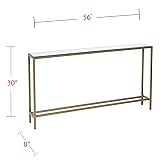 Versatile long console table; Slim metal and mirror profile; Metallic gold Distinctive, beveled mirrored tabletop; Clean, sleek look; Transitional style w/ hint of glam Living room, hall/entry, dining room, or open concept living space Overall: 56" W x 8" D x 30" H; Assembly: Easy to assemble