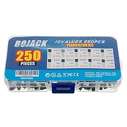 BOJACK High Quality Power Transistors Assortment Kit. Product Name: Power Transistors Transistor Type: PNP & NPN Transistor Model: 10 Values, Include: A1015 PNP, BC327 PNP, BC337NPN, C1815 NPN, S8050 NPN, S8550 PNP, 2N2222 NPN, 2N2907 PNP, 2N3904 NPN, 2N3906 PNP. Package Quantity: 250pcs (Each model 25pcs), Packed in A Rugged Convenient Re-sealable Plastic Storage Case.