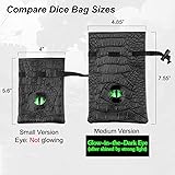 Cool Dragon Eye Dice Bag- Hand made DND dice bag with quality PU leather(artificial) and a 3D cool dragon eye on front. Quick to open and shut drawstring design for the closing Travel Size Dice Bag: Palm size for Size Small(3.93x5.5" when flat). Able to hold 3-5 sets of metal dice or other standard 7pcs dnd dice. If more room is needed, choose Medium or Large instead. Size large can stand up upright on it's own Eye-catch Fun for Dragon Lovers- The dragon eye is super vivid with ultra-clear glass. Wonderful gamers gift for dragon lovers, d&d gamers or fans of Game of Thrones Portable and Easy to Set-up- Designed to ensure portability. With the easy to use elastic snap, you can close or open the bag in one second Versatile Game Pieces Storage Bag- Perfect storage bag or cosplay accessory for gamers of dungeons and dragons and other ttrpg games. Also a great storage pouch from small things as watches, keys, phone, jewelries, etc