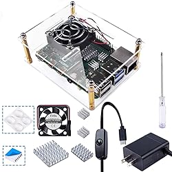 Upgrade Acrylic 2 Layers Clear Case with Large Fan and Large Heatsinks designed for Raspberry Pi 4 Model B 1GB / 2GB / 4GB, Compatible with Pi 3 B+/ Pi 3B/ 2B. (NOTE: RPI board is not included) Better Cooling System, the large quite cooling fan and 4 pcs aluminum heat sinks are better for heat dissipation of case for Raspberry Pi 4. Size of fan : 35 x 35 mm. Size of heatsinks for CPU: 25 x 25 mm Full access to all ports, such as the dual micro HDMI port, USB-C power connector port, Audio/Video port, USB and Ethernet ports and micro SD card slot ETL Listed 3A USB-C power supply for Raspberry Pi 4. With on/off switch, it's convenience to power on and power off your RPI 4. Output: 5V 3A. Cable length: 5ft If for ANY reason you aren't completely satisfied with the case, please let us know and we will give you a satisfy solution